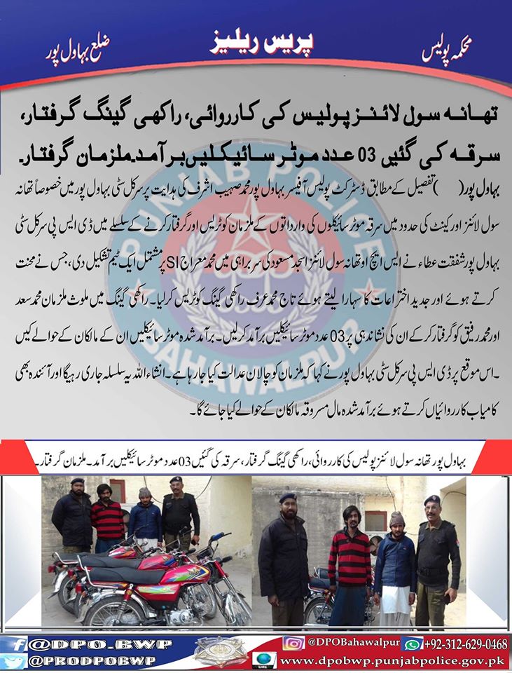 تھانہ سول لائنز پولیس کی کارروائی ،راکھی گینگ گرفتار،سرقہ کی گئیں 03عدد موٹرسائیکلیں برآمد،ملزمان گرفتار۔