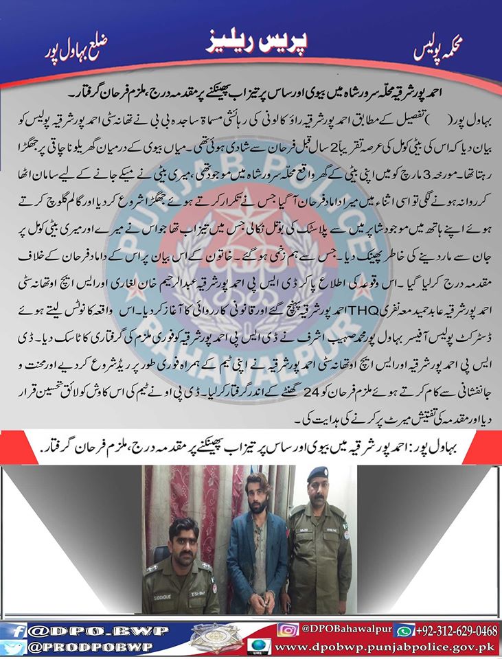 احمدپورشرقیہ محلہ سرور شاہ میں بیوی اور ساس پر تیزاب پھینکنے پر مقدمہ درج ،ملزم فرحان گرفتار۔