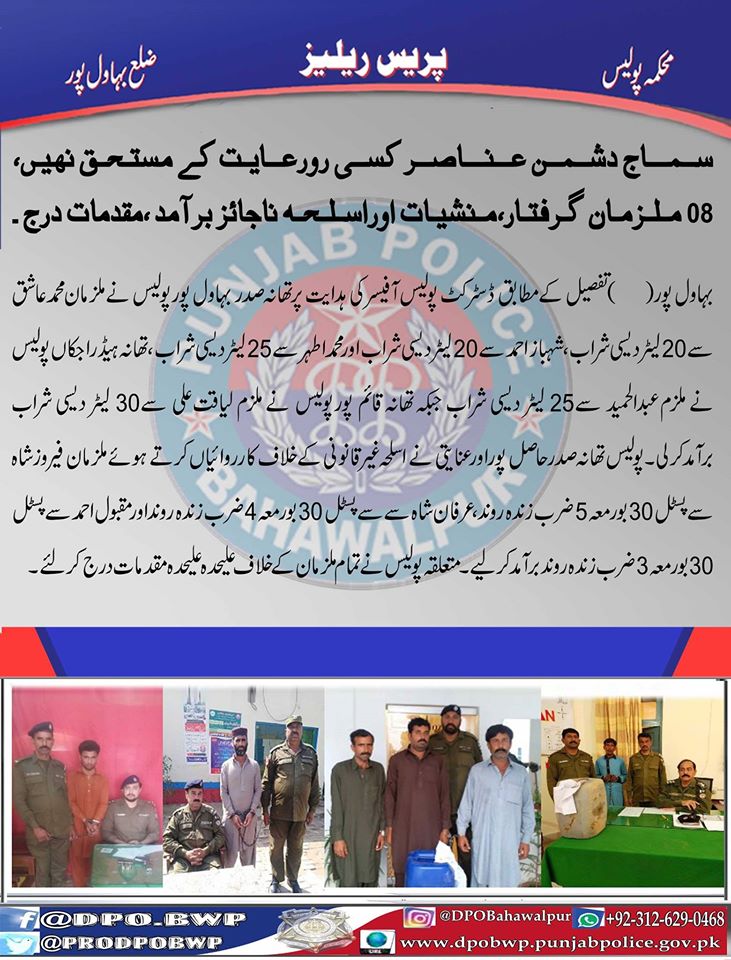 سماج دشمن عناصر کسی رورعایت کے مستحق نہیں ، 08 ملزمان گرفتار،منشیات اور اسلحہ ناجائز برآمد ،مقدمات درج۔
