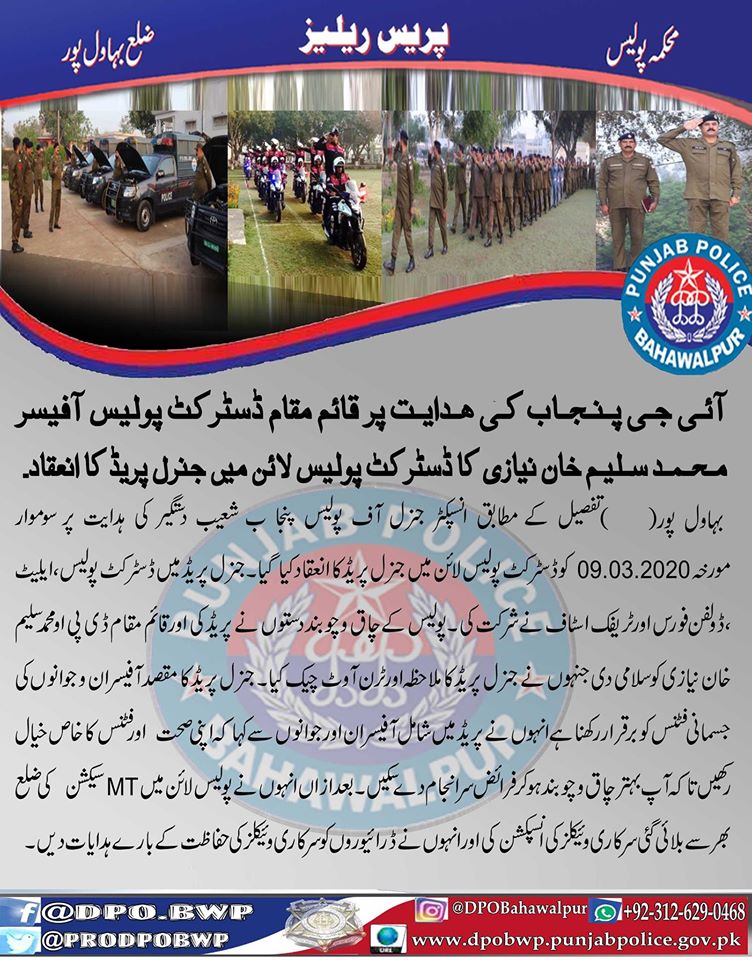 آئی جی پنجاب کی ہدایت پر قائم مقام ڈسٹرکٹ پولیس آفیسر محمد سلیم خان نیازی کا ڈسٹرکٹ پولیس لائن میں جنرل پریڈ کاانعقاد ۔