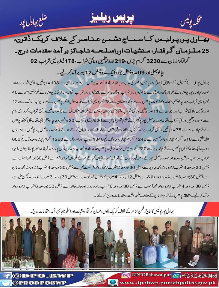 بہاولپور پولیس کا سماج دشمن عناصر کے خلاف کریک ڈاؤن ،25 ملزمان گرفتار، منشيات اور اسلحہ ناجائز برآمد، مقدمات درج۔