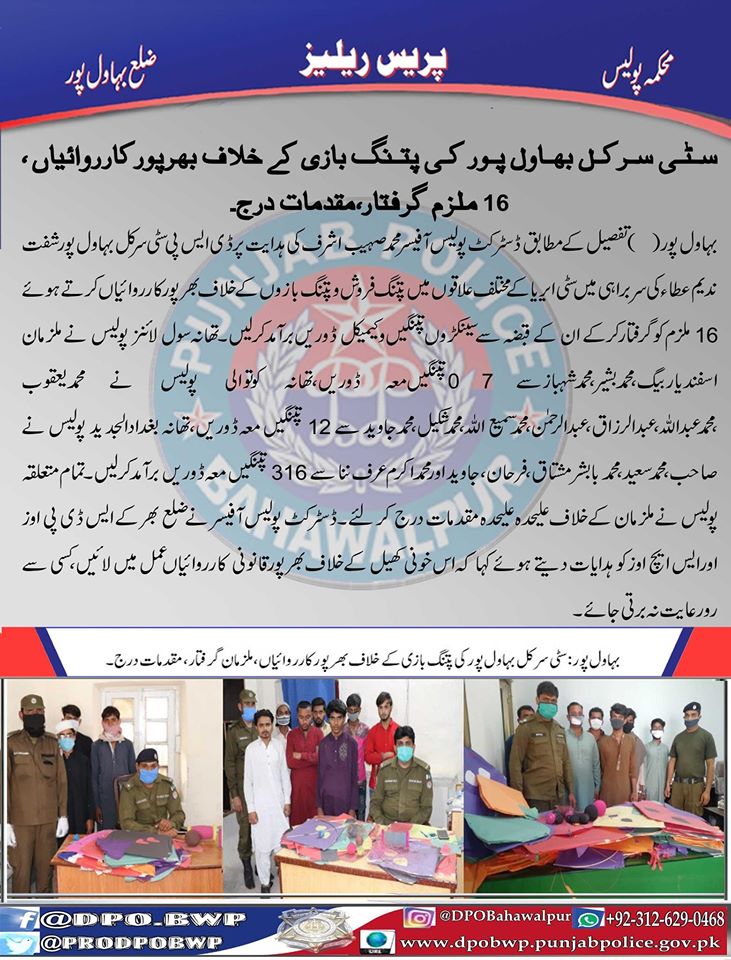 سٹی سرکل بہاولپور کی پتنگ بازی کے خلاف بھرپور کارروائیاں ،16ملزمان گرفتار،مقدمات درج