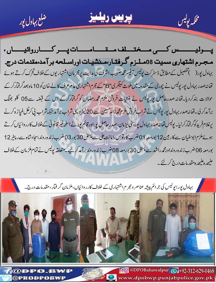 پولیس کی مختلف مقامات پر کارروائیاں ، مجرم اشتہاری سمیت 08 ملزم گرفتار،منشیات اور اسلحہ برآمد، مقدمات درج۔