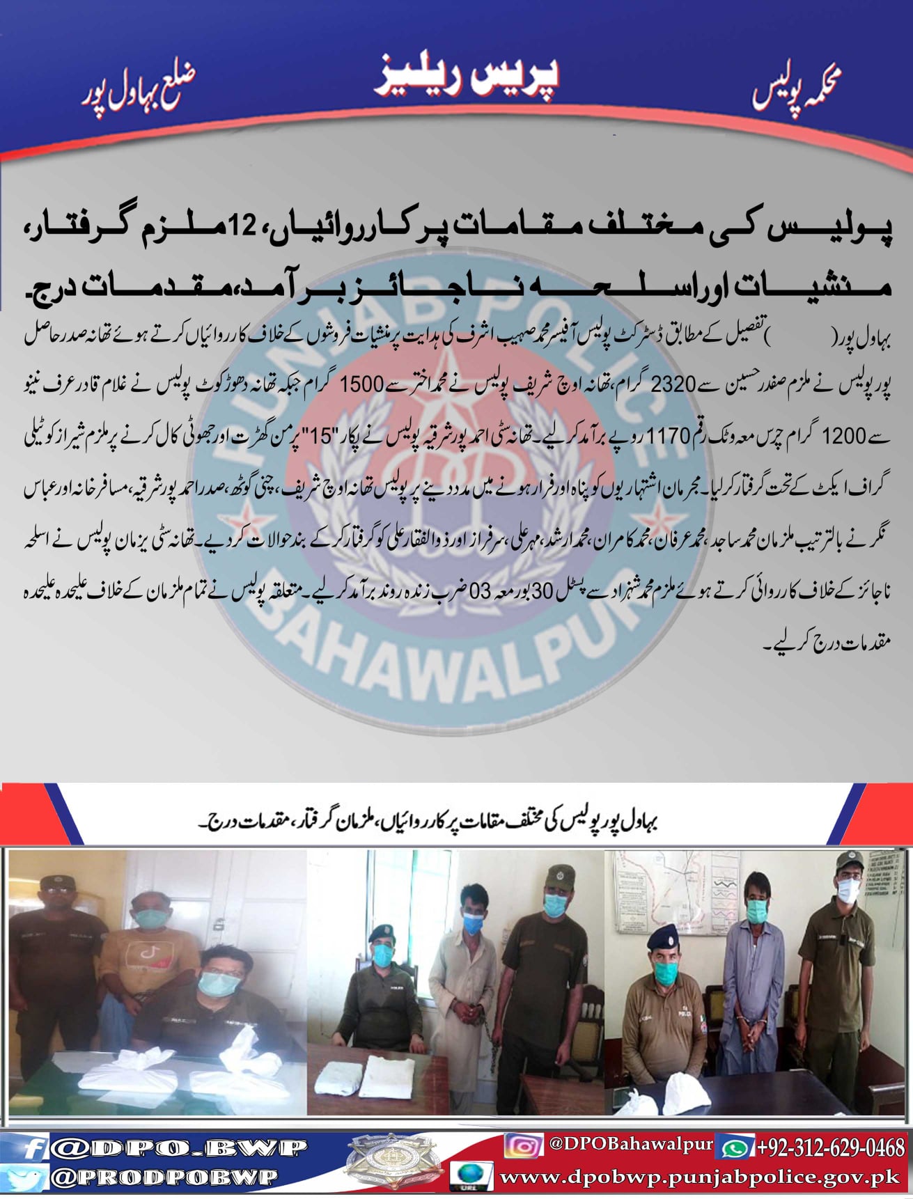 پولیس کی مختلف مقامات پر کارروائیاں ، 12 ملزم گرفتار، منشیات اور اسلحہ ناجائز برآمد ، مقدمات درج