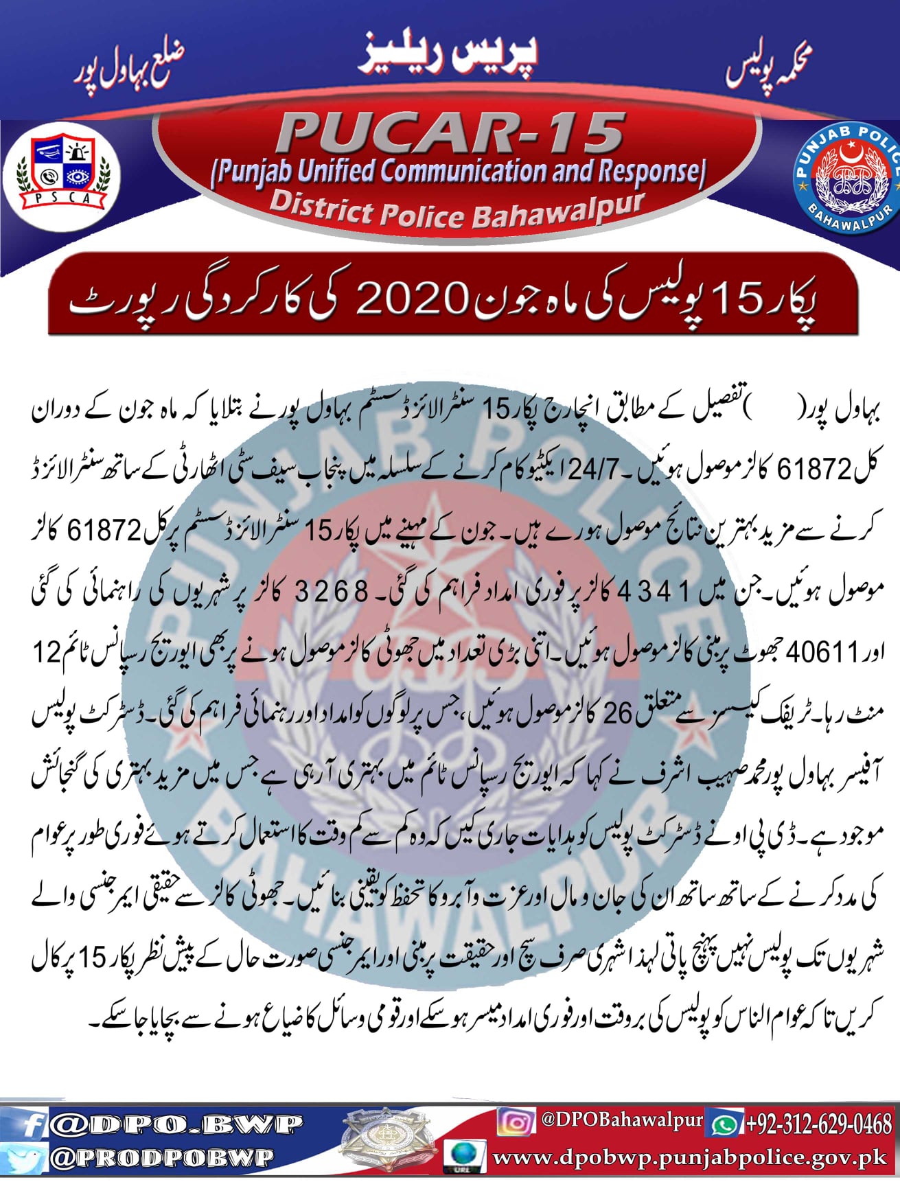 پکار 15 سنٹرالائزڈ سسٹم بہاول پور کی ماہ جون 2020ء کی کارگزاری، ماہ جون کے دوران کل 61872 کالزم موصول ہوئیں