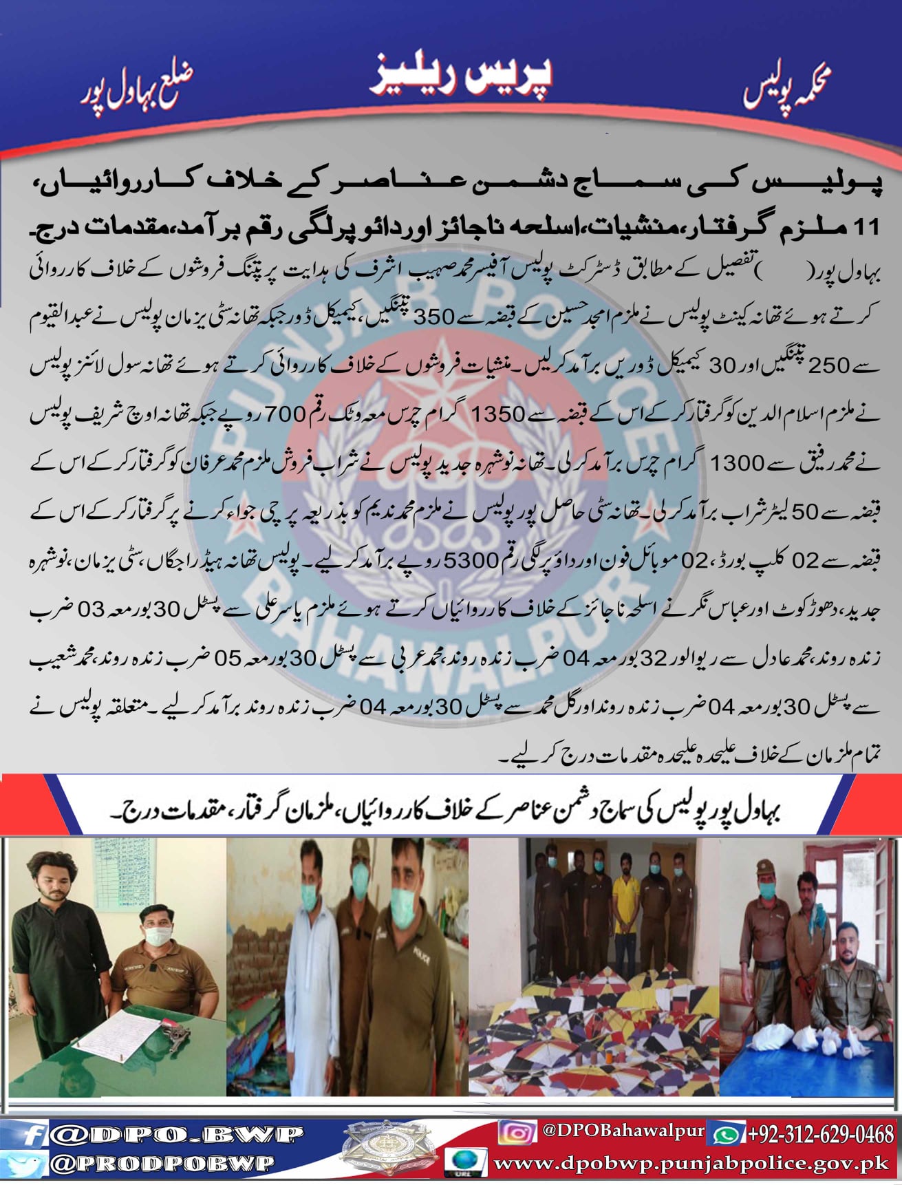 پولیس کی سماج دشمن عناصر کے خلاف کارروائیاں ، 11 ملزمان گرفتار، منشیات ، اسلحہ ناجائز اور دائو پر لگی رقم برآمد، مقدمات درج