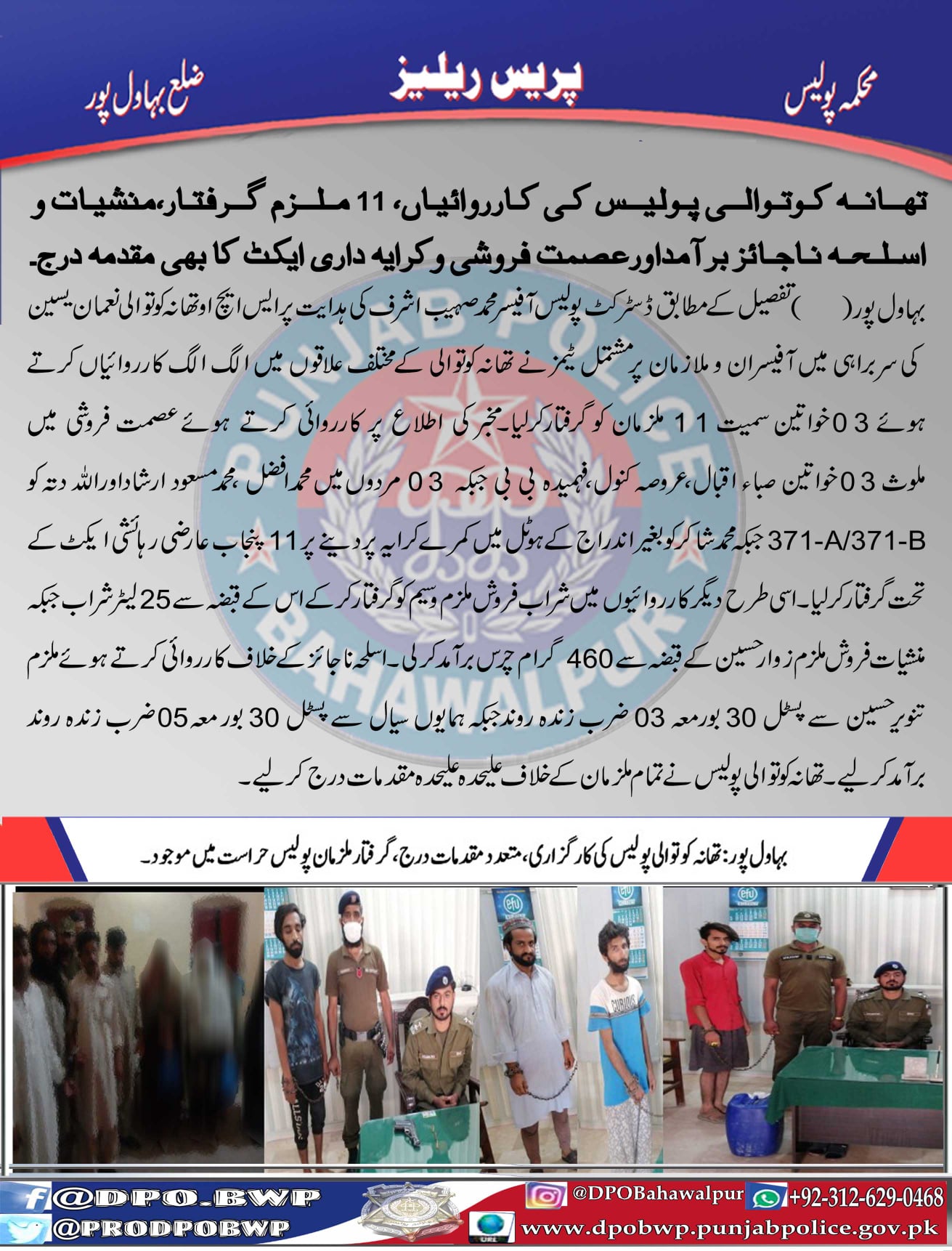 تھانہ کوتوالی پولیس کی کارروائیاں ، 11 ملزم گرفتار، منشیات و اسلحہ ناجائز برآمد اور عصمت فروشی و کراییہ داری ایکٹ کا بھی مقدمہ درج۔