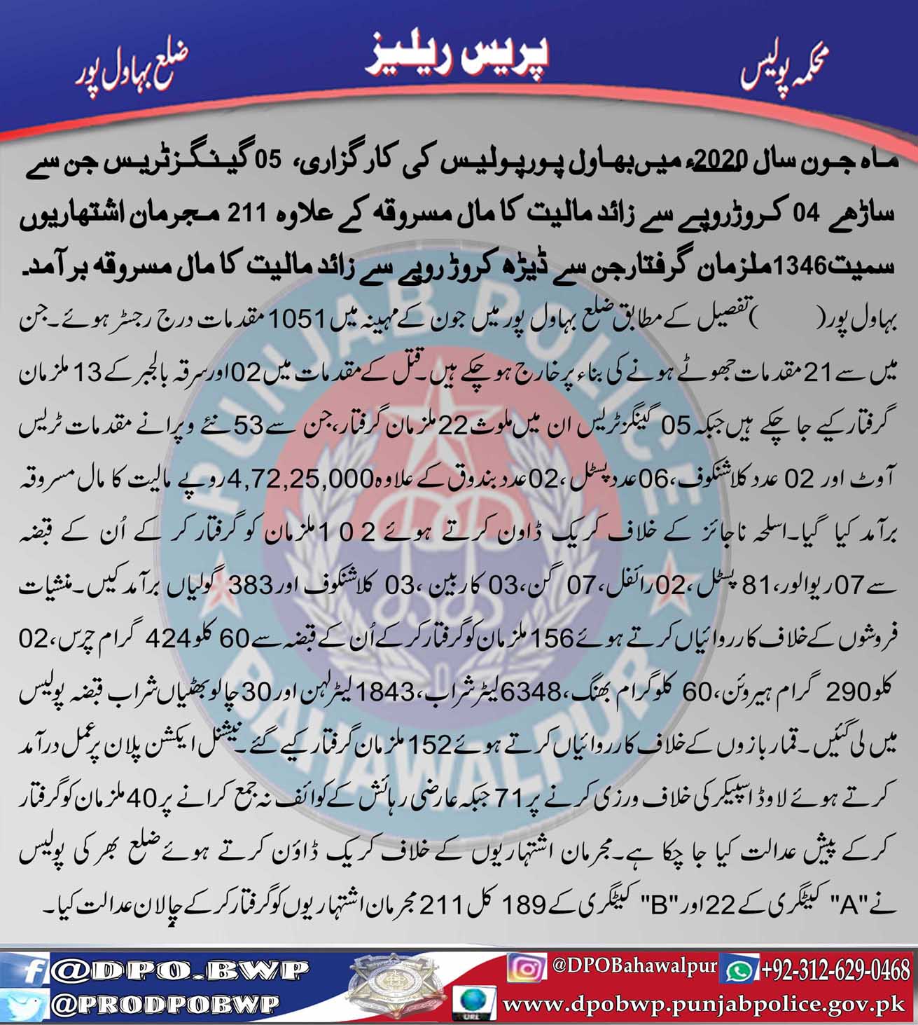 ماہ جون سال 2020 ء میں بہاول پور پولیس کی کارگزاری ، 05 گینگز ٹریس جن سے ساڑھے 04کروڑ روپے سے زائد مالییت کا مال مسروقہ کے علاوہ 211 مجرمان اشتہاریوں سمیت 1346ملزمان گرفتار جن سے ڈیڑھ کروڑ روپے سے زائد مالیت کا مال مسروقہ برآمد۔۔۔