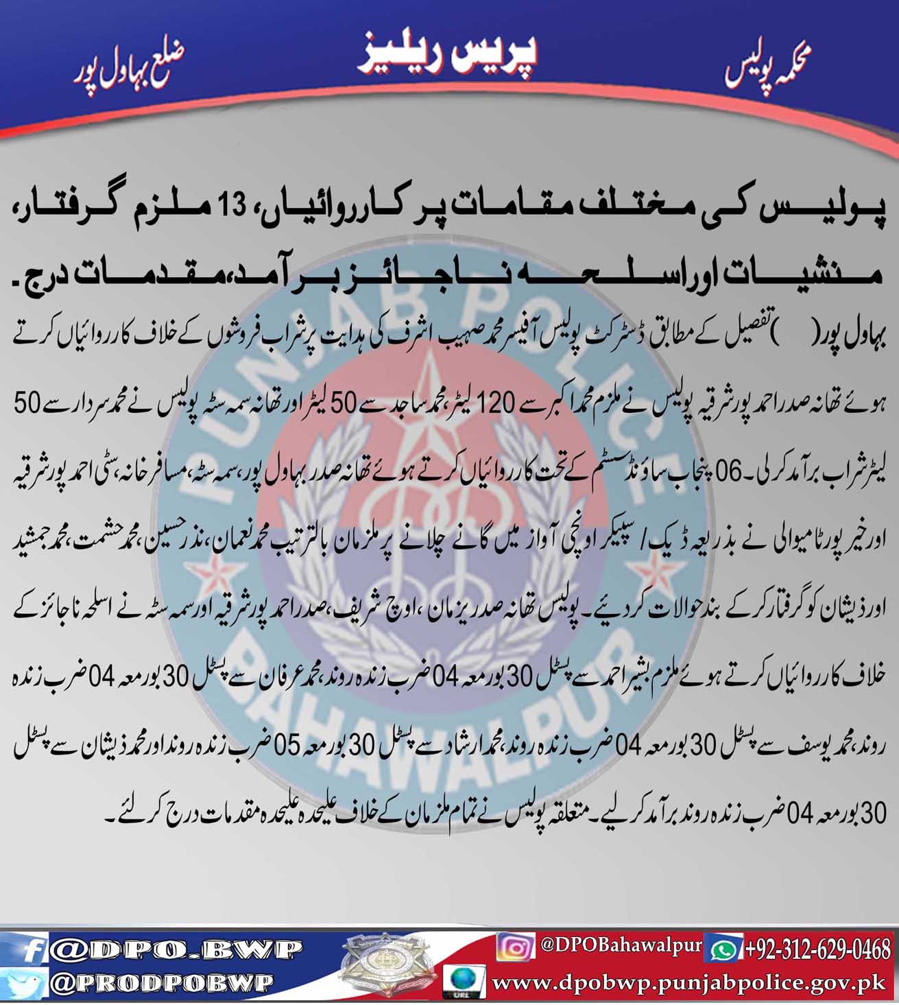 پولیس کی مختلف مقامات پر کارروائیاں ، 13 ملزم گرفتار، منشیات اور اسلحہ ناجائز برآمد مقدمات درج۔۔