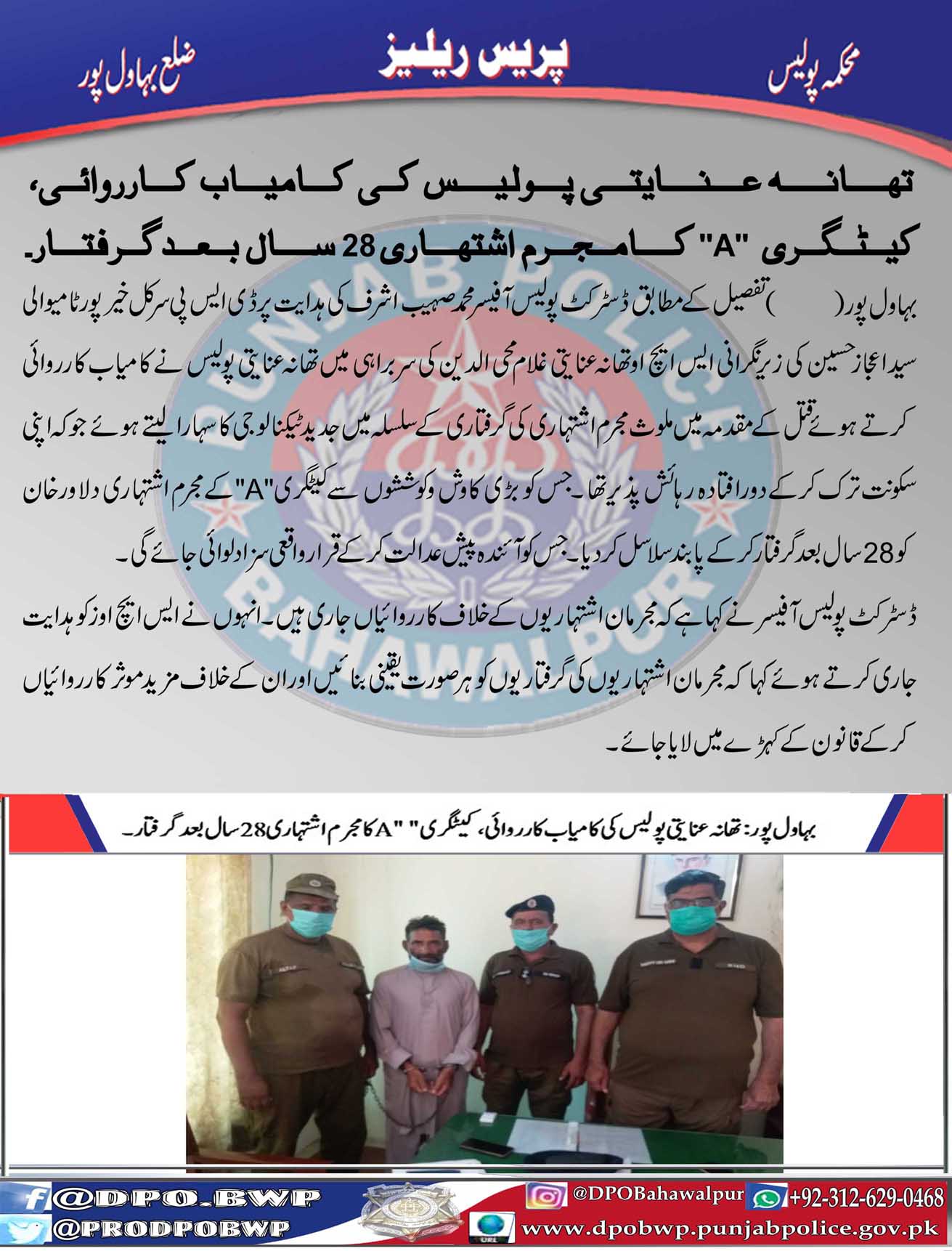 تھانہ عنایتی پولیس کی کامیاب کارروائی، کیٹگری اے کا مجرم اشتہاری 28سال بعد گرفتار۔