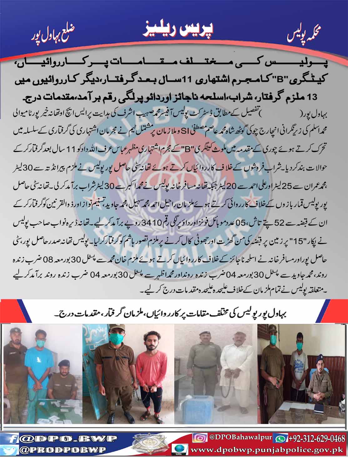 پولیس کی مختلف مقامات پر کارروائیاں، کیٹگری بی کا مجرم اشتہاری 11سال بعد گرفتار، دیگر کارروائیوں میں 13 ملزمان گرفتار، شراب اسلحہ ناجائز اور دائو پر لگی رقم برآمد ، مقدمات درج