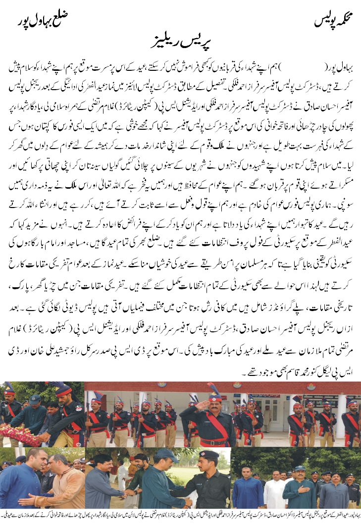 ہم اپنے شہداء کی قربانی کو کبھی فراموش نہیں کرسکتے ،عید کے پرمسرت موقع پر شہدائے پولیس کوسلام پیش کرتے ہیں ڈسٹرکٹ پولیس آفیسر سرفراز احمد فلکی