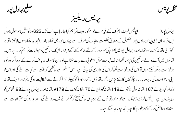 پولیس فرنٹ ڈیسک کے قیام سے عوام کو ریلیف فراہم کیا جارہا ہے۔ اب تک 622درخواستیں موصول ہوئی۔ ترجمان ڈسٹرکٹ پولیس بہاولپور