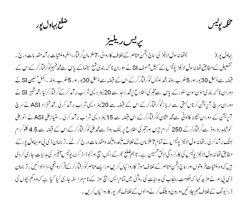 ۔تھانہ سول لائنز بہاولپور پولیس کی سماج دشمن عناصر کا خلاف کارروائی 7 ملزمان گرفتار اسلحہ اور منشیات برآمد