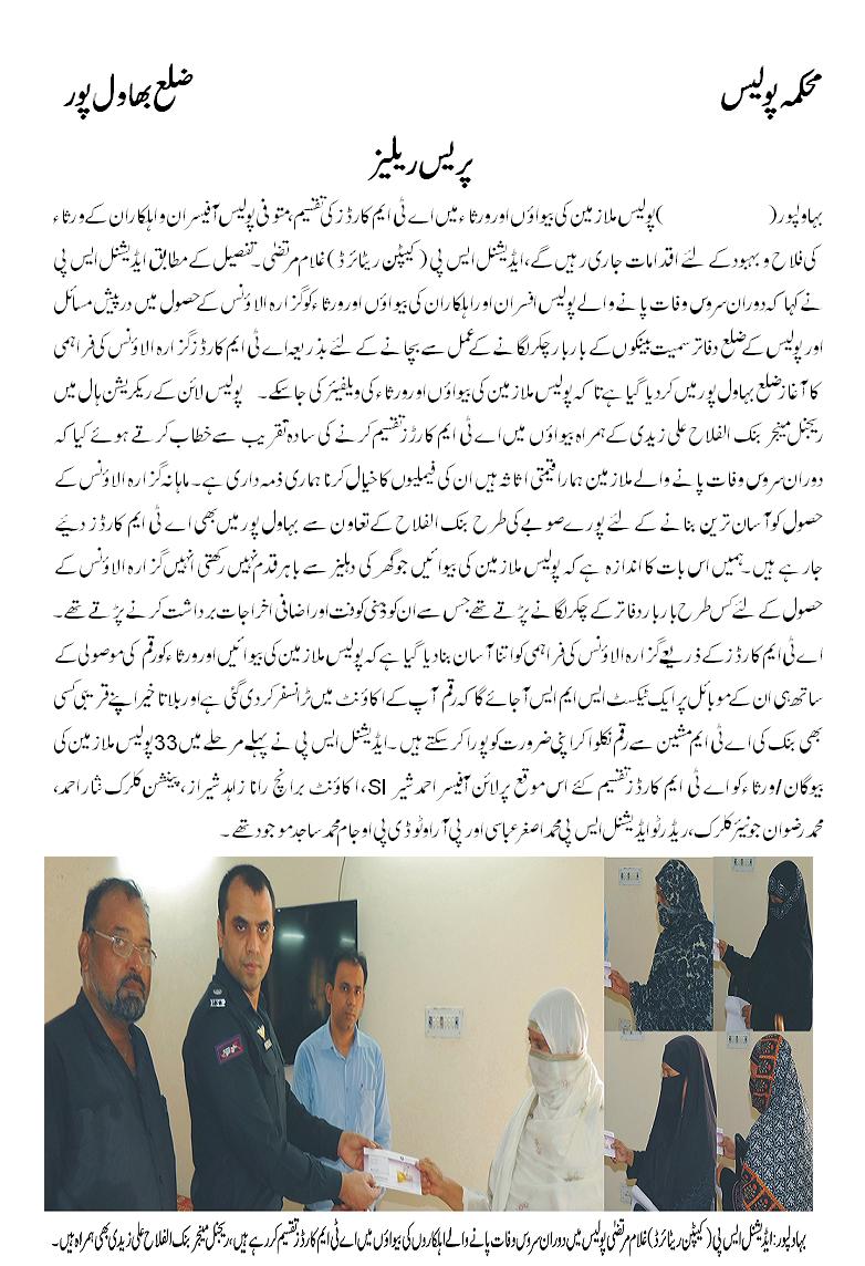 پولیس ملازمین کی بیواؤں اور ورثا میں اے ٹی ایم کارڈ کی تقسیم متوفی پولیس آفیسران و اہلکاروں کی فلاح و بہبود کے لیے اقدام جاری رہیں گے۔ ایڈیشنل ایس پی ( کیپٹن ریٹائرڈ) غلام مرتضیٰ