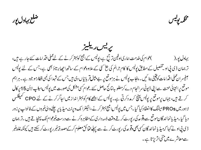عوام کی خدمت ہماری اولین ترجیح ہے۔ پولیس کے امیج کوبہتر کرنے کے لیے عملی اقدامات کیے جا رہے ہیں ۔ترجمان ڈسٹرکٹ پولیس بہاولپور