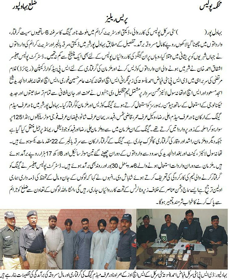 سٹی سرکل کی کارروائی ڈکیتی اور اسٹریٹ کرائم میں ملوث نادر گینگ کا سرغنہ 6ساتھیوں سمیت گرفتار وارداتوں میں چھینا گیا لاکھوں روپے کا مال مسروقہ برآمد
