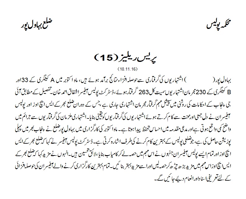 اشتہاریوں کی گرفتاری سے حوصلہ افزاء نتائج برآمد ہوئے ہیں ،ماہ اکتوبر میں اے کیٹگری کے 33ملزمان اوربی کیٹگری کے 230 ملزمان سمیت 263ملزمان گرفتار ہوئے۔ ڈی پی او بہاولپور