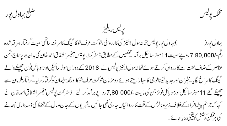 شوکت عرف شوکا گینگ کا سرغنہ ساتھی سمیت گرفتار، سرقہ شدہ رقم-/ 780000 سمیت 11موٹرسائیکل برآمد