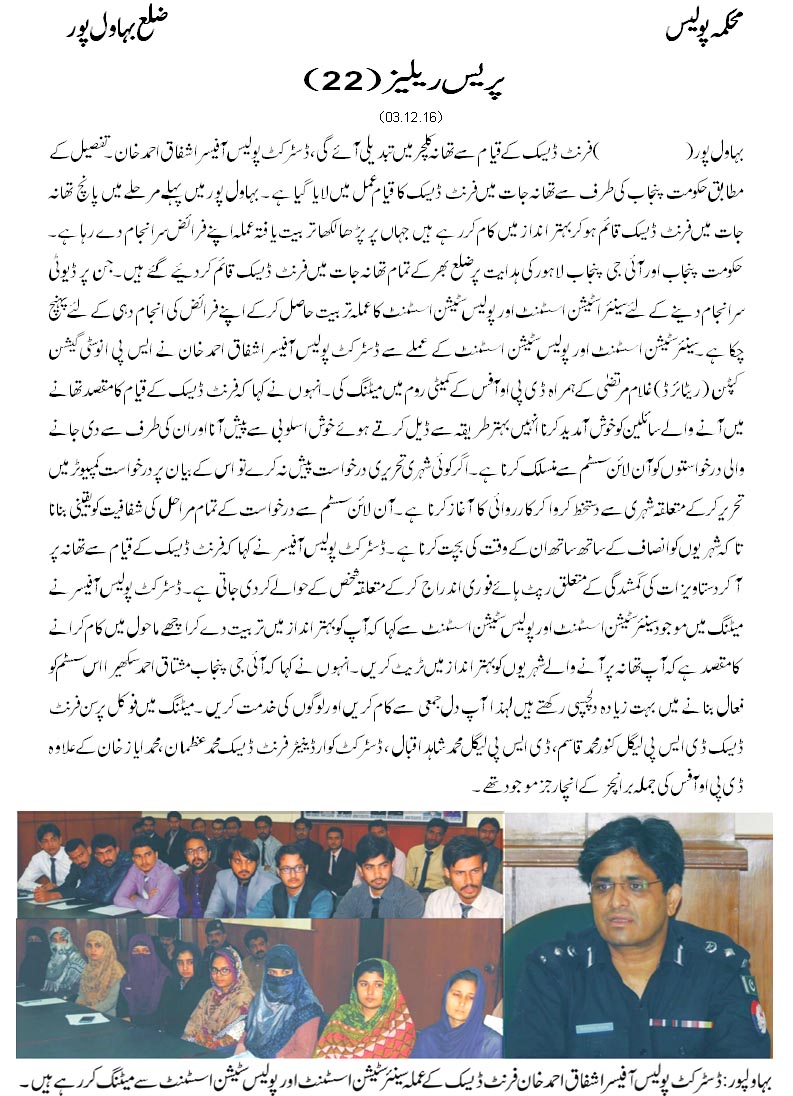 فرنٹ ڈیسک کے قیام سےلوگوں کو تھانہ کلچر میں تبدیلی آئے گی ڈسٹرکٹ پولیس آفیسر اشفاق احمد خان