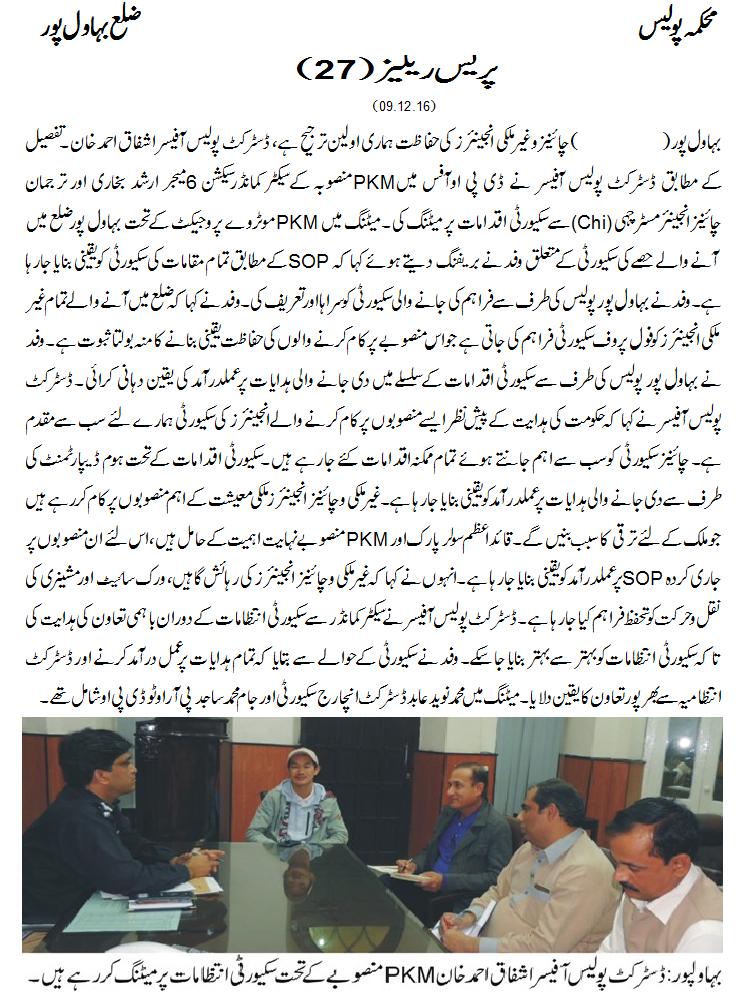 چائنیز و غیر ملکی انجینئر کی حفاظت ہماری اولین ترجیح ہے ،ڈسٹرکٹ پولیس آفیسر .اشفاق احمد خان
