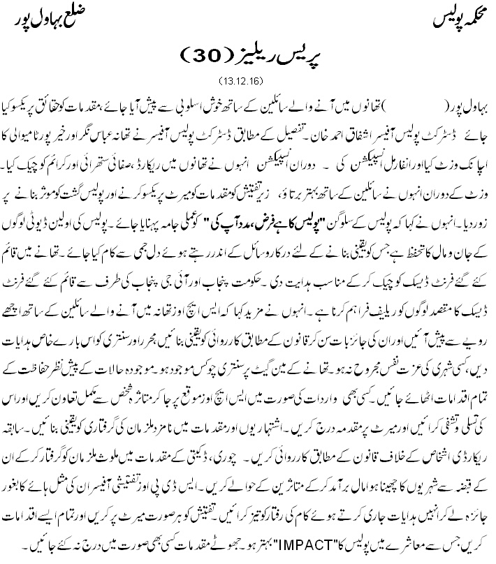 تھانہ میں آنے والے سائلین کے ساتھ خوش اسلوبی سے پیش آیا جائے ڈسٹرکٹ پولیس آفیسر بہاولپور ۔ اشفاق احمد خان