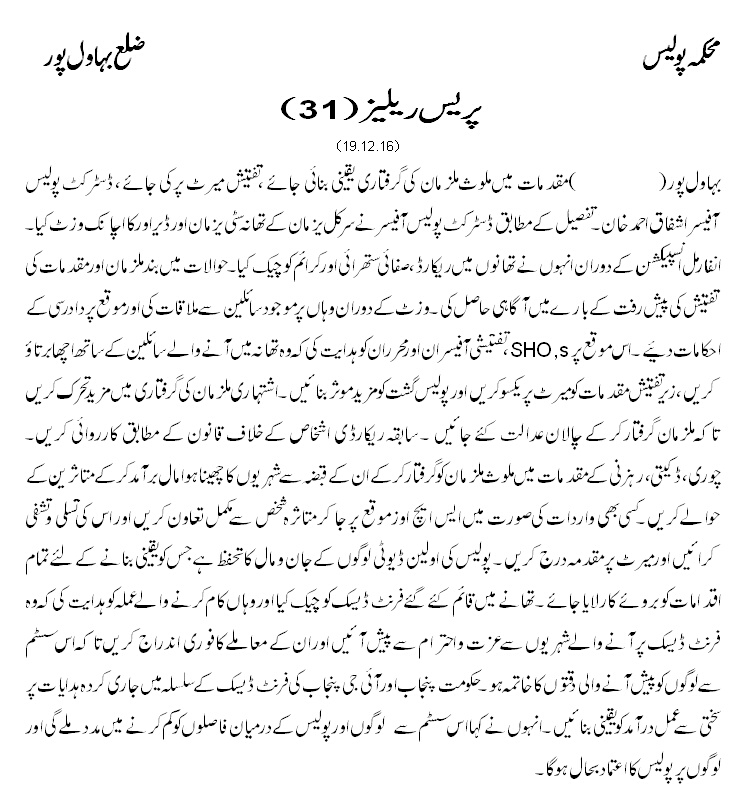مقدمات ملوث ملزمان کی گرفتاری کو یقینی بنا یا جائے تفتیش میرٹ پر کی جائے ڈسٹرکٹ پولیس آفیسر بہاولپور ۔