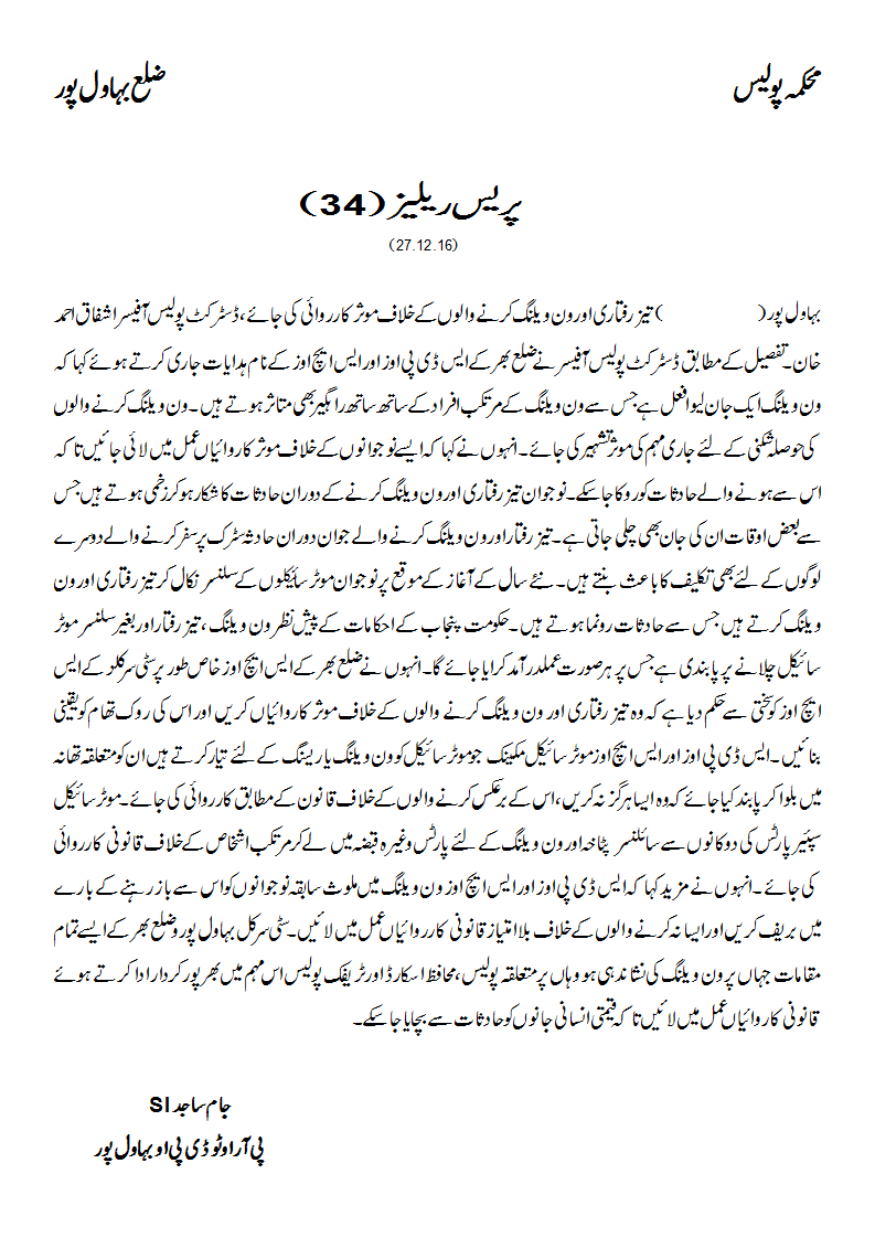 تیز رفتاری اور ون ویلنگ کرنے والوں کے خلاف موثر کارروائی کی جائے ۔ڈسٹرکٹ پولیس آفیسر اشفاق احمد خان