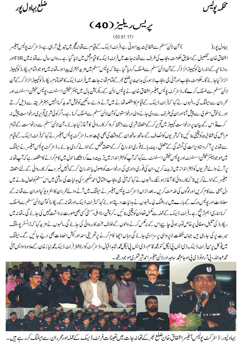 آن لائن سسٹم سے شفافیت پیدا ہوتی ھے ، فرن ڈیسک کے قیام سے تھانہ کلچر میں تبدیلی آرہی ھے .ڈسٹرکٹ پولیس آفیسر بہاولپور اشفاق احمد خان