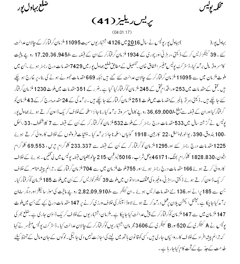 بہاولپور پولیس نے سال 2016 میں 4126 اشتہاریوں سمیت 11095 ملزمان گرفتار کر کے چالان عدالت کیے۔