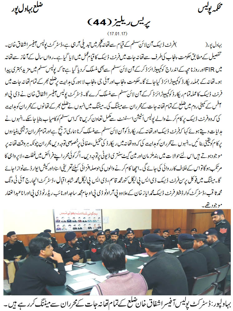 ۔فرنٹ ڈیسک کے قیام سےلوگوں کو تھانہ سے ریلیف فراہم کیا جا رہا ہے ڈسٹرکٹ پولیس آفیسر بہاولپور اشفاق احمد خان