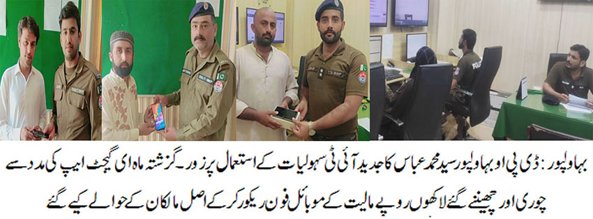 تفصیلات کے مطابق ڈی پی او بہاولپور سید محمد عباس نے جدید آئی ٹی سہولیات کو استعمال کرتے ہوئے ماڈرن پولیسنگ کے نظریہ کو فروغ دینے بارے ہدایات جاری کیں۔ڈی پی او بہاولپور سید محمد عباس کی کمانڈ پر جرائم پیشہ افراد کی سرکوبی کا سلسلہ جاری ہے ۔ماہ جولائی 2023میں بہاولپور پولیس نے ای گیجٹ کی مدد سے لاکھوں روپے مالیت کے 189موبائل فون ریکور کرکے اصل مالکان کے حوالے کیے ۔پنجاب پولیس کے ای ۔گیجٹ ایپ کا استعمال موثر ثابت ہو رہا ہے ۔ موبائل فون چوری یا چھین لیا جائے تو اس کو اب آسانی سے ریکور کیا جاسکتا ہے۔پنجاب پولیس نے ای گیجٹ نام کی موبائل ایپ متعارف کرائی ہے جسے آسانی سے پلے سٹور سے ڈان لوڈ کیا جا سکتا ہے، جس کے بعد کوئی بھی دکاندار اس کی مدد سے باآسانی جان سکے گا کہ اس کے پاس موجود موبائل فون جو کہ فروخت کرنے کیلئے آیا ہے کسی واردات میں ملوث یا چوری کا تو نہیں ہے جس بابت خدشہ ہونے یا علم ہونے کی صورت میں فوری متعلقہ پولیس کو اطلاع دی جاتی ہے دور حاضر میں پولیس کی جانب سے جدید ٹیکنالوجی کے استعمال سے کئی وارداتیں ٹریس کی جا رہی ہیں جس سے معاشرے میں پولیس کا وقار مزید بلند ہو رہا ہے۔