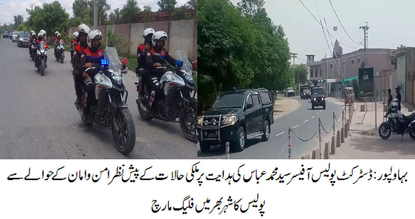 بہاول پور( )ڈسٹرکٹ پولیس آفیسر سید محمد عباس کی ہدایت پر ایس پی انوسٹی گیشن سلمان لیاقت کی زیر قیادت ملکی حالات کے پیش نظر امن و امان کے حوالے سے پولیس کا شہر بھر میں فلیگ مارچ، شرپسند عناصر کو واضح پیغام ، کسی صورت شہر کا امن خراب ہونے نہیں دیں گے۔ ڈی پی او سید محمد عباس۔