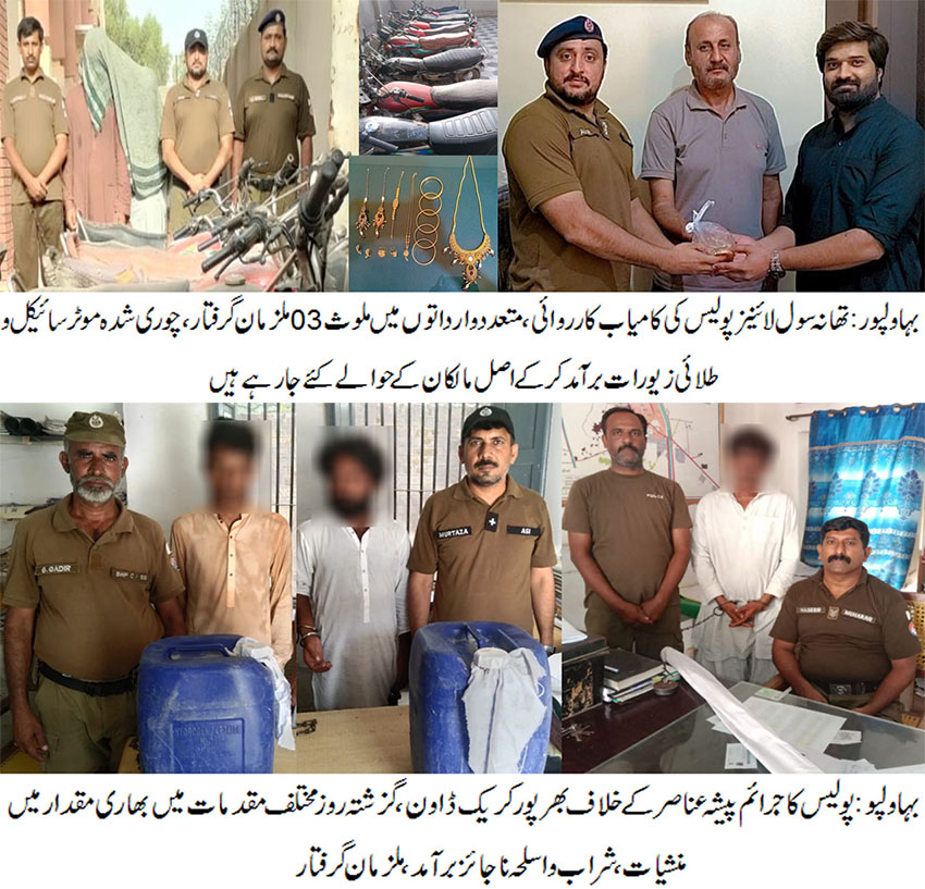 بہاولپور( )ڈی پی او سید محمد عباس کے احکامات، تھانہ سول لائینز پولیس کی کامیاب کارروائی، چوری کی متعدد وارداتوں میں ملوث 03 ملزمان گرفتار۔گرفتار ملزمان کے قبضہ سے لاکھوں روپے مالیت چوری شدہ 12 موٹر سائیکل اور 13 تولہ طلائی زیورات برآمد۔ معاشرے کے ایسے منفی عناصر کے خلاف مزید کارروائیاں جاری رکھی جائیں گی،ڈی پی او