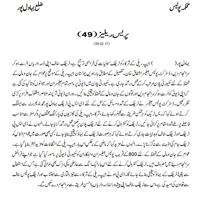 جیپ ریلی کے شرکاء کو ٹریفک سہولیات کی فراہمی ترجیح ہے ٹریفک اسٹاف اپنی ذمہ داریاں الرٹ ہوکر سر انجام دیں ۔اشفاق احمد خان