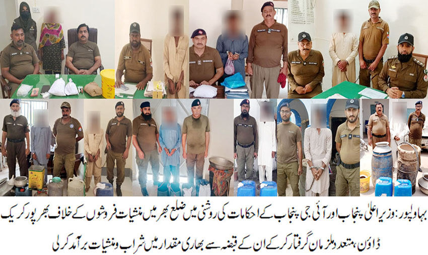 بہاولپور( )وزیر اعلی پنجاب اور آئی جی پنجاب کے احکامات کی روشنی میں ضلع بھر میں منشیات فروشوں کے خلاف بھرپور کریک ڈائون، گزشتہ 48گھنٹے میں متعدد ملزمان گرفتار کرکے ان کے قبضہ سے بھاری مقدار میں شراب و منشیات برآمد کرلی۔ضلع بہاولپور کو منشیات سے پاک کرنے کا عزم۔ ڈی پی او سید محمد عباس