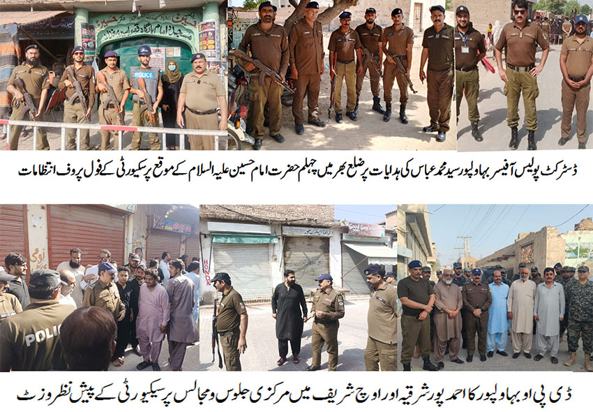 ڈسٹر کٹ پولیس آفیسر بہاولپور سید محمد عباس کی ہدایات پر ضلع بھر میں چہلم حضرت امام حسین علیہ السلام کے موقع پر سکیورٹی کے فول پروف انتظامات، ڈی پی او نے احمد پور شرقیہ اور اوچ شریف میں مرکزی جلوس و مجالس پر سیکیورٹی کے پیش نظر وزٹ کیا اور مناسب ہدایات جاری کیں