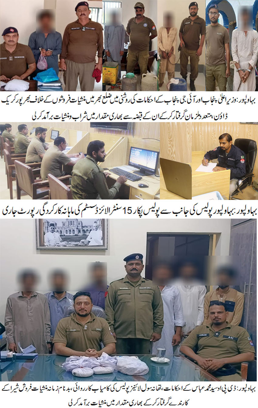 تفصیلات کے مطابق وزیر اعلی پنجاب اور انسپکٹر جنرل آف پولیس پنجاب کی طرف منشیات فروشوں کی سرکوبی کے لئے جاری کردہ احکامات کی روشنی میں ڈسٹرکٹ پولیس آفیسر سید محمد عباس نے ضلع بھر کے ایس ایچ اوز کو سپیشل ٹیمیں تشکیل دے کر منشیات فروشوں کی گرفتاری کا ٹاسک دیا تھا، جس کے نتیجہ میں بہاولپور پولیس کا منشیات فروشوں کے خلاف بھرپور ایکشن جاری ہے۔ گزشتہ 24گھنٹے میں 10مقدمات درج رجسٹرڈ کئے ۔گرفتار ملزمان کے قبضہ سے 327لیٹر دیسی شراب، 01 عدد چالو بھٹی، 03کلو 860گرام چرس،20گرام کرسٹل آئس برآمد کرلی۔اس موقع پر ڈی پی او سید محمد عباس نے افسران کو ہدایات جاری کرتے ہوئے کہا کہ منشیات فروشوں کے خلاف خفیہ سٹنگ آپریشن کو مزید تیز کیا جائے۔منشیات مافیا کے خلاف بلا امتیاز کارروائیاں عمل میں لائی جائیں گی، خاص کر تعلیمی اداروں میں یہ فعل ہر گز برداشت نہیں کیا جائے گا۔ اس مہم میں تمام تر وسائل کو بروئے کار لاتے ہوئے مزید کارروائیاں عمل میں لائی جائیں۔ انہوں نے مزید کہا کہ منشیات ایک لعنت ہے جس کا بہاولپور سے خاتمہ ہر صورت یقینی بنایا جائے گا۔