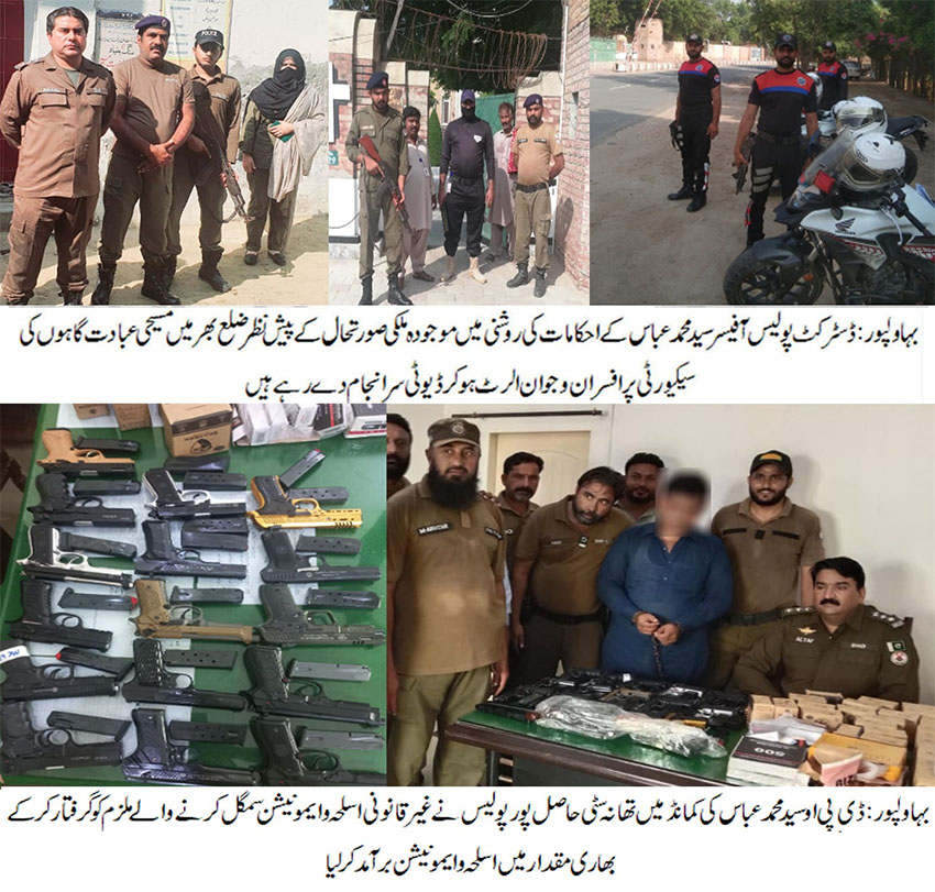 تفصیلات کے مطابق آئی جی پنجاب کی ہدایات کی روشنی میں ڈسٹرکٹ پولیس آفیسر سید محمد عباس کی کمانڈ میں بہاولپور پولیس کو کامیابیاں ملنے کا سلسلہ جاری ہے۔ اس سلسلے کو جاری رکھتے ہوئے تھانہ سٹی حاصلپور پولیس نے بڑی کارروائی کی اور غیر قانونی طور پر ناجائز اسلحہ و ایمونیشن سمگل کرنے والے ملزم سلمان محمود جو کہ ضلع وہاڑی کا رہائشی ہے کو گرفتار کر لیا۔ ملزم اسلحہ کو ایک جگہ سے دوسری جگہ منتقل کرنے والا تھا جو کہ بعد میں منفی سرگرمیوں کیلئے استعمال کیا جانا تھا۔ ملزم کے قبضہ سے بھاری مقدار میں غیر قانونی اسلحہ جس میں مختلف اقسام کے 16 پستول ، 1 رائفل 44 بور اور ہزاروں گولیاں و کارتوس برآمد کر لیے ۔ پولیس نے مقدمہ درج کر کے تفتیش شروع کر دی۔ اس موقع پر ڈی پی او سید محمد عباس نے بات کرتے ہوئے کہا کہ جرائم پیشہ افراد کے خلاف اسی طرز پر کارروائیاں جاری رہیں گی اور غیر قانونی اسلحہ سمگلنگ میں ملوث افراد کو قانون کے مطابق سخت سزا دلوائی جائے گی۔ انہوں نے مزید کہا کہ بہاولپور پولیس ہر صورت شہریوں کی حفاظت کی ذمہ دار ہے اور احساس تحفظ کو مزید مستحکم کیا جائے گا۔ ڈی پی او نے بہترین کارکردگی پر تھانہ سٹی حاصلپور پولیس کو شاباش دی۔