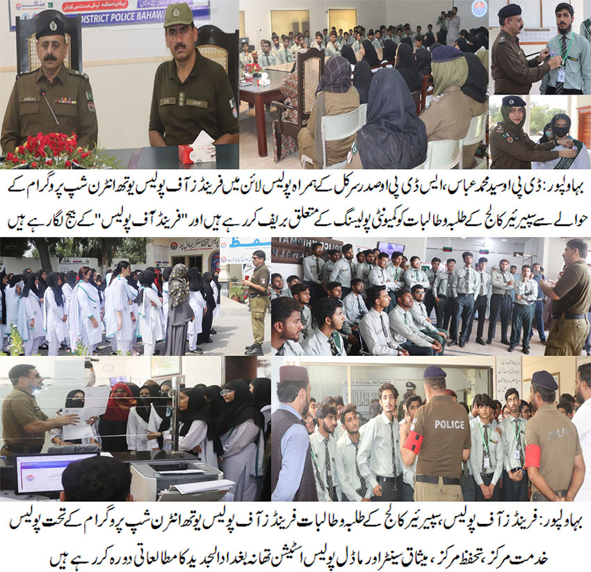 بہاولپور( ) فرینڈز آف پولیس//سپیرئیر کالج کے طلبہ و طالبات کا فرینڈز آف پولیس یوتھ انٹرن شپ پروگرام کے تحت بہاولپور پولیس لائنز، پولیس خدمت مرکز، تحفظ مرکز، میثاق سینٹر اور ماڈل پولیس اسٹیشن تھانہ بغداد الجدید کا ایک روزہ مطالعاتی دورہ، ڈی پی او سید محمد عباس نے بہاولپور پولیس کی ورکنگ اور کمیونٹی پولیسنگ سے متعلق طلبہ کو بریف کیا