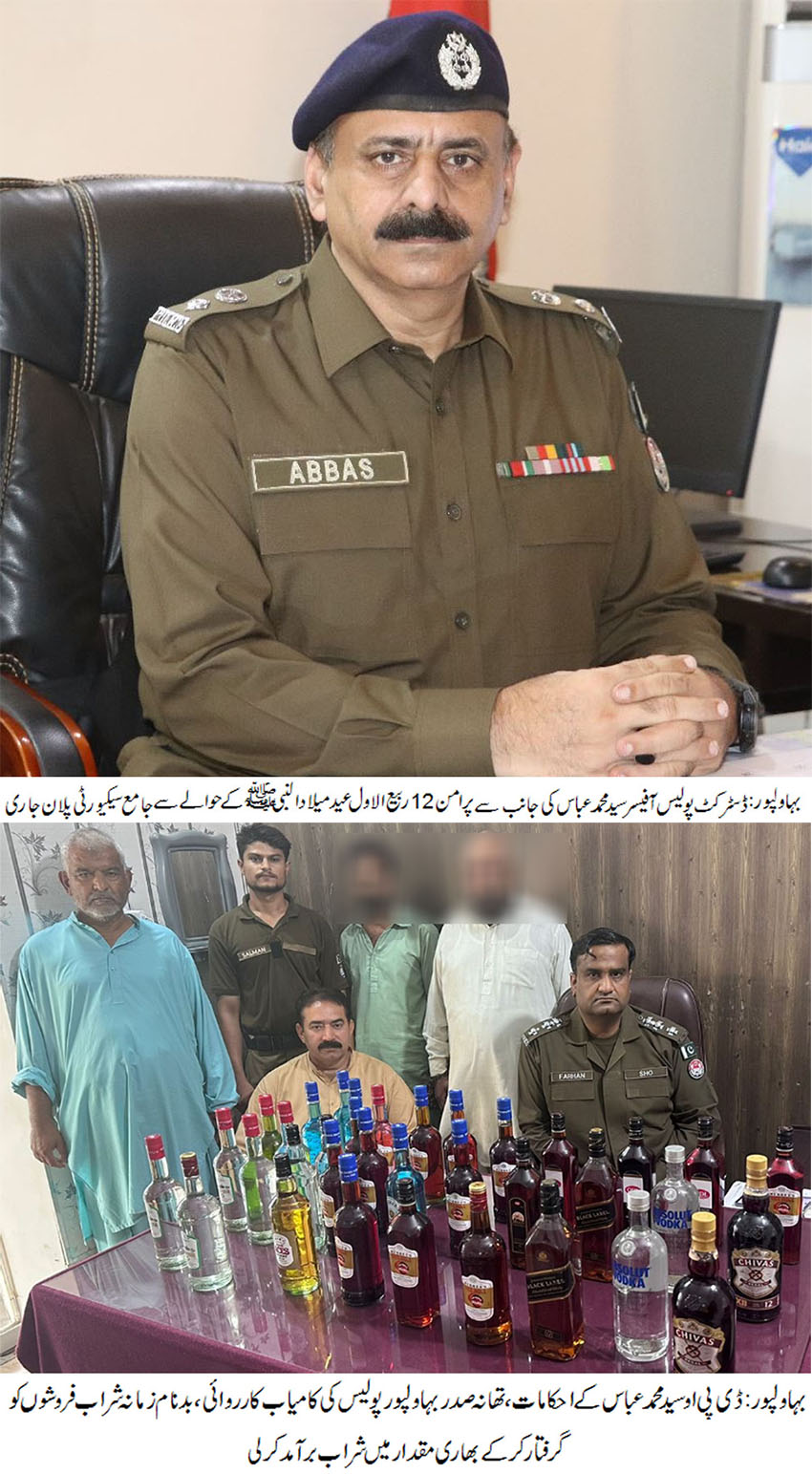 بہاولپور( )ڈی پی او سید محمد عباس کے احکامات، تھانہ صدر بہاولپور پولیس کی کامیاب کارروائی، بدنام زمانہ شراب فروشوں کو گرفتار کرکے بھاری مقدار میں شراب برآمد کر لی۔جرائم پیشہ افراد کا تعاقب جاری رکھا جائیگا ،ڈی پی او