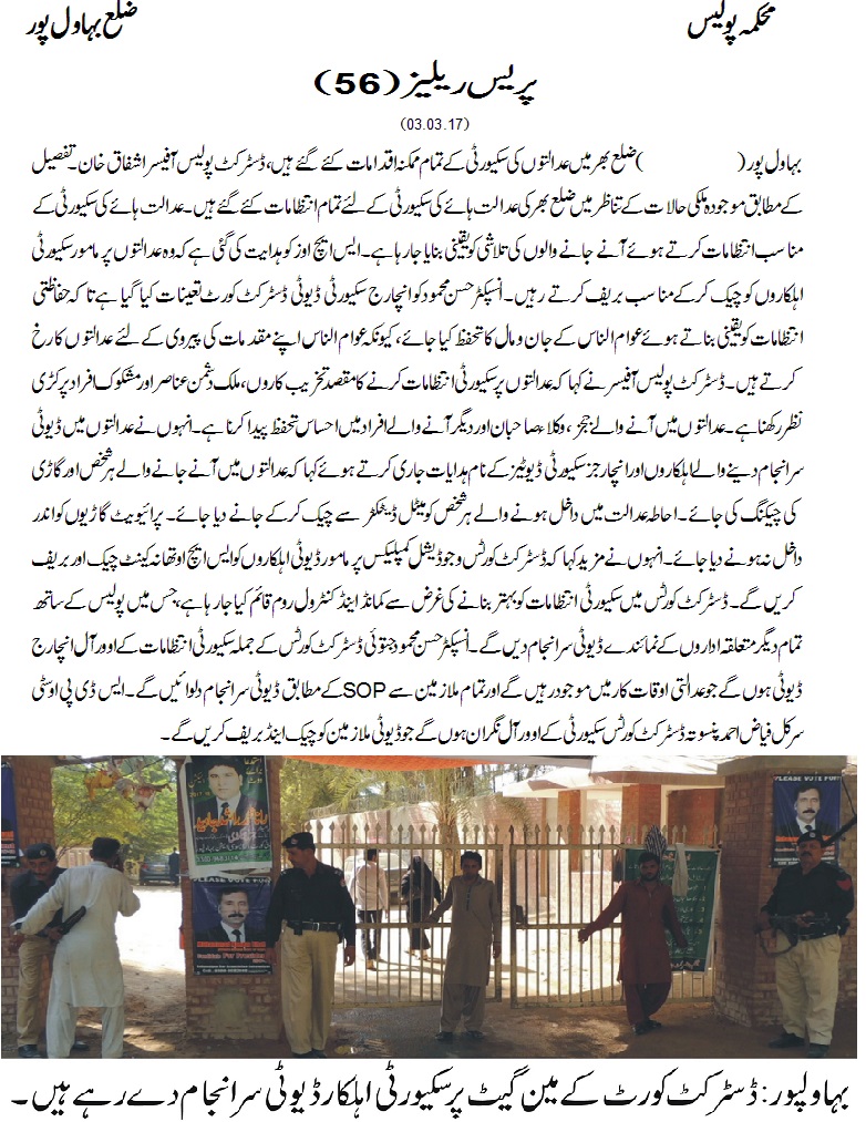 ضلع بھر میں عدالتوں کی سکیورٹی کے تمام ممکنہ اقدامات کئے گئے ہیں ۔ ڈسٹرکٹ پولیس آفیسر اشفاق احمد خان