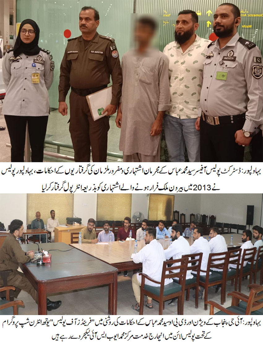تفصیلات کے مطابق انسپکٹر جنرل آف پولیس پنجاب اور ایڈیشنل انسپکٹر جنرل آف پولیس جنوبی پنجاب کی مفرور ملزمان کی گرفتاریوں کے حوالے جاری احکامات کی روشنی میں ڈسٹرکٹ پولیس آفیسر سید محمد عباس نے بہاولپور سے بیرون ملک فرار ہونے والے مجرمان اشتہاریوں کی گرفتاریوں اور ان کے خلاف ضابطہ کی کارروائیاں کرنے کے احکامات جاری کئے ، جس کے نتیجہ میں بہاولپور پولیس نے 2013 میں ملک سے فرار ہونے والے مجرم اشتہاری محمد سلیم ولد محمد ابراہیم جو کہ مقدمہ نمبر 121/13 بجرم 395 ت پ ( ڈکیتی) میں تھانہ سمہ سٹہ پولیس کو مطلوب تھا، کو بذریعہ انٹر پول ریڈ وارنٹ جاری کروا کر بیرون ملک سے گرفتار کرکے بہاولپور لایا گیا ہے۔ڈسٹرکٹ پولیس آفیسر سید محمد عباس نے اس حوالے سے بات کرتے ہوئے کہا کہ مجرم جتنا بھی ہوشیار کیوں نہ ہو قانون کی گرفت سے نہیں بچ سکتا۔شہریوں کی دادرسی اس صور ت میں ہوسکتی ہے جب ہم ان کے جان ومال کی نقصان کرنے والوں کو آہنی ہاتھوں سے نمٹیں گے۔ انہوں نے مزید کہا کہ آئی جی پنجاب کے احکامات کی روشنی میں مزید ایسی کارروائیوں کا سلسلہ جاری رہے گا اور مفرور ملزمان کو گرفتار کر کے قانون کے کٹہرے میں لایا جائے گا۔