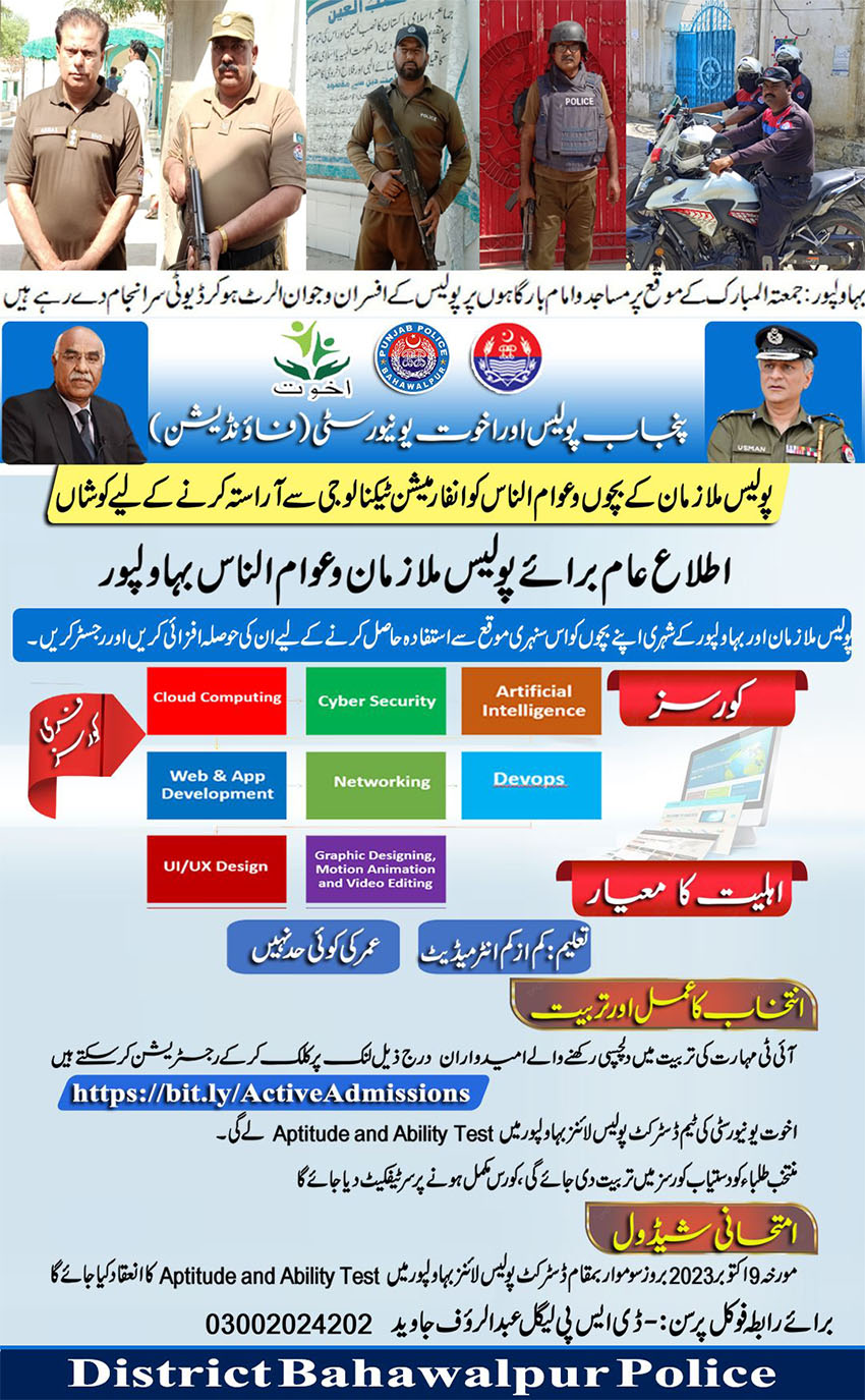 اخوت یونیورسٹی کی ٹیم ڈسٹرکٹ پولیس لائن بہاولپور میں مورخہ 09اکتوبر 2023بروز سوموار بوقت 9:00بجے صبح ابتدائی ٹیسٹ لے گی۔ منتخب طلبا کو دستیاب کورسز میں تربیت دی جائے گی، کورس مکمل ہونے پر سرٹیفکیٹ بھی دیا جائے گا۔ جبکہ کورس پاس کرنے والے بچوں کو مستقبل میں پنجاب پولیس کی آئی ٹی فیلڈ میں بھرتی کیلئے ترجیح دی جائے گی۔