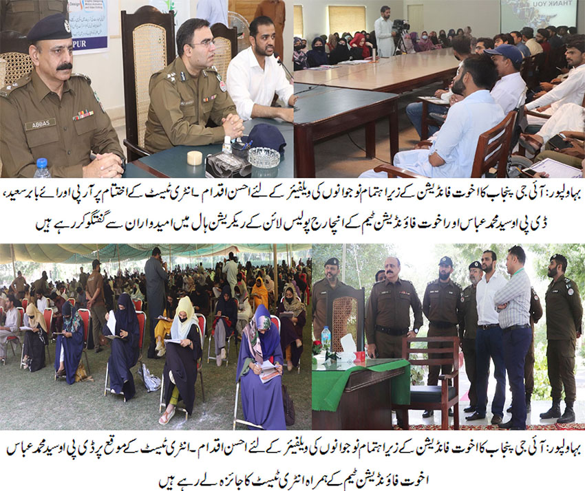 بہاولپور( )آئی جی پنجاب کا اخوت فانڈیشن کے زیر اہتمام شہدا پولیس، حاضر سروس پولیس افسران کے بچوں اور بے روزگار، ضرورت مند نوجوانوں کی ویلفیئر کے لئے احسن اقدام۔ پولیس لائن بہاولپور میں فری جدید آئی ٹی کورسز کے حوالے سے ابتدائی ٹیسٹ کا انعقاد کیا گیا۔ انٹری ٹیسٹ میں بہاولپور ریجن کے تینوں اضلاع سے امیدواروں نے حصہ لیا۔بے روزگار نوجوانوں کیلئے موجودہ دور میں باعزت روزگار کمانے کا سنہری موقع فراہم کیا جا رہا ہے جبکہ شہریوں اور پولیس کے درمیان فاصلوں کو کم کیا جا رہا ہے۔ آر پی او بہاولپور رائے بابر سعید