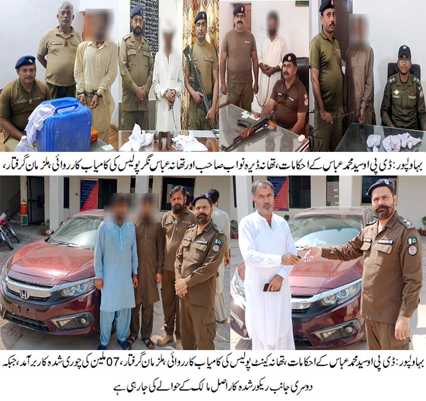 تفصیلات کے مطابق آئی جی پنجاب کی جرائم کی سرکوبی کیلئے جاری ہدایات اور ڈی پی او بہاولپور سید محمد عباس کی سربراہی میں جرائم پیشہ عناصر کے خلاف جاری مہم میں بڑی کامیابیاں ملنے کا سلسلہ جاری ہے۔ تھانہ کینٹ پولیس نے جدید ٹیکنالوجی کا استعمال کرتے ہوئے اسپیشل ٹیم تشکیل دے کر انتھک محنت کے بعد متعدد وارداتوں میں ملوث ملزمان کو گرفتار کرلیا، گرفتار ملزمان سے متعدد مقدمات ٹریس ہوئے۔ گرفتار ملزمان کے قبضہ سے چوری شدہ 07ملین کی کار Honda civicبرآمد کرلی گئی۔ ریکور شدہ کار اصل مالک کے حوالے کی جارہی ہے۔ ڈی پی او سید محمد عباس نے اس موقع پر کہا کہ شہریوں کا لوٹا ہوا مال جرائم پیشہ افراد سے ریکور کرایا جا رہا ہے تاکہ شہریوں کو زیادہ سے زیادہ ریلیف مہیا کیا جا سکے۔ انہوں نے مزید کہا بہاولپور پولیس جرائم کی بیخ کنی کیلئے بہترین حکمت عملی کو اپنا کر جرائم پیشہ افراد کا تدارک جاری رکھے گی۔ ڈی پی او سید محمد عباس نے بہترین کارکردگی پر ایس ایچ او تھانہ کینٹ و ٹیم کو شاباش دی۔