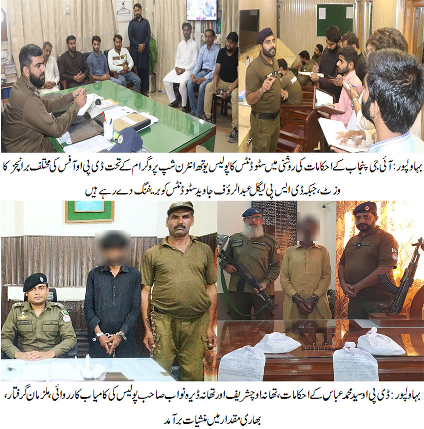 تفصیلات کے مطابق آئی جی پنجاب ڈاکٹر عثمان انور کے ویژن کے مطابق ڈی پی او بہاولپور سید محمد عباس کی ہدایات پر پنجاب پولیس یوتھ انٹرن شپ پروگرام کے تحت مختلف سٹوڈنٹس کا دو ہفتوں پر مشتمل انٹرن شپ پروگرام کے حوالے سے روزانہ کی بنیاد پر ورکشاپس جاری ہیں۔ پہلے ہفتے میں سٹوڈنٹس کے لئے پولیس لائن میں بریفنگ اور پولیس ورکنگ کے متعلق سیکھنے کا عمل ختم ہوچکا ہے ۔انٹرن شپ کے دوسرے ہفتے تمام سٹوڈنٹس کو ضلع کے مختلف پولیس پراجیکٹس اور تھانہ جات میں اٹیچ کیا جارہا ہے، اسی حوالے سے تمام سٹوڈنٹس نے امروز ڈی پی او آفس کا وزٹ کیا ۔اس دوران انہوں نے مختلف برانچز کے وزٹ کئے جہاں انہیں پولیس ورکنگ اور پولیس ویلفیئر کے متعلق بریف کیا گیا۔ سٹوڈنٹس نے ڈسٹرکٹ آئی ٹی برانچ، ویلفیئر برانچ اور مختلف لیگل برانچز کا وزٹ کرایا گیا۔ وزٹ کے موقع پر فوکل پرسن ڈی ایس پی لیگل عبدالرف جاوید نے تمام سٹوڈنٹس کو پولیس کے مختلف پراجیکٹس کے متعلق بریفنگ دی۔ واضح رہے کہ سٹوڈنٹس نے خود کو فرینڈز آف پولیس یوتھ انٹرن شپ پروگرام میں انرول کیا۔ اس کے علاوہ جو بھی طالبعلم اس انٹرنشپ پروگرام کیلئے انرول ہونا چاہتا ہے وہ پنجاب پولیس پبلک ایپ پر دیے گیے آپشن کے ذریعے انرولمنٹ حاصل کر سکتا ہے۔ اس موقع پرسٹوڈنٹس کا کہنا تھا کہ پولیس کے اس خوبصورت اور سافٹ چہرے کو پہلی دفعہ دیکھا ہے جس کا ہمیں کبھی اندازہ نہیں ہوا کہ پولیس شہریوں کیلئے اس قدر لگن اور محنت سے کام کر رہی ہے۔ ڈسٹرکٹ پولیس آفیسر سید محمد عباس نے اس حوالے سے بات کرتے ہوئے کہا کہ انٹرن شپ پروگرام کے تحت نوجوانوں کو پولیس کی ورکنگ اور پولیس کی طرف سے عوام الناس کیلئے دی جانے والی سہولیات اور سروسز کو قریب سے دیکھنے اور سیکھنے کا موقع ملے گا تاکہ پولیس اور عوام کے درمیان کمیونٹی پولیسنگ کو فروغ دیتے ہوئے خلیج کو کم کیا جا سکے۔