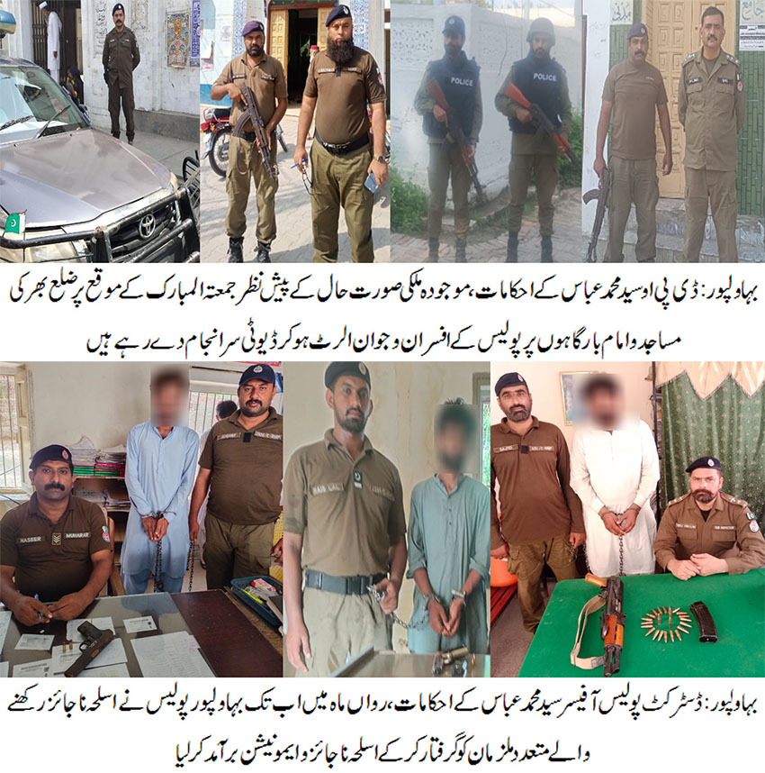 بہاول پور( )ڈی پی او سید محمد عباس کے احکامات، جمعتہ المبارک کے روز ایس ڈی پی اوز اور ایس ایچ اوز کے سیکیورٹی کے حوالے سے مساجد اور امام بارگاہوں کے وزٹ،موجودہ ملکی صورتحال کے پیش نظر ڈیوٹی پر مامور اہلکاروں کو الرٹ رہنے کی ہدایت،سیکیورٹی فرائض میں غفلت ہرگز برداشت نہیں کی جائے گی،ڈسٹرکٹ پولیس آفیسر سید محمد عباس