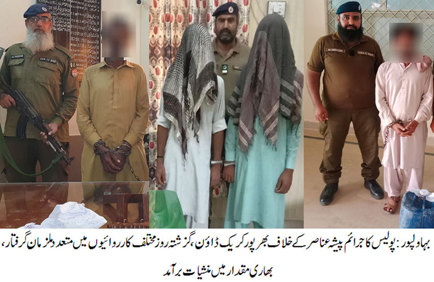 تفصیلات کے مطابق ڈی پی او بہاولپور سید محمد عباس کی طرف سے جرائم پیشہ افراد کے خلاف جاری مہم میں بڑی کامیابیاں ملنے کا سلسلہ جاری ہے۔ تھانہ بغدادالجدید اور تھانہ صدر بہاولپور پولیس نے منشیات فروشوں کے خلاف کارروائیاں عمل میں لاتے ہوئے 03ملزمان زاہد علی، اسلم اور سعید احمد کو گرفتار کرکے ان کے قبضہ سے 03کلو 640گرام چرس اور 20گرام کرسٹل آئس برآمد کرلی۔اسی طرح تھانہ صدر حاصل پور پولیس نے شراب فروشی کے مرتکب 02ملزمان غلام محمد اور سرورکو گرفتار کرکے اس کے قبضہ سے 26لیٹر شراب برآمد کرلی۔ گرفتار ملزمان کے خلاف علیحدہ علیحدہ مقدمات درج کر کے تفتیش شروع کر دی۔ اس موقع پر ڈی پی او سید محمد عباس نے اپنے پیغام میں کہا کہ جرم جیسا بھی ہو قانون سے کسی صورت بچ نہیں سکتا، شراب اور منشیات ایک لعنت ہے، معاشرے کو ایسے ناسور عناصر سے پاک کرنا پولیس کی اولین ترجیح ہے۔