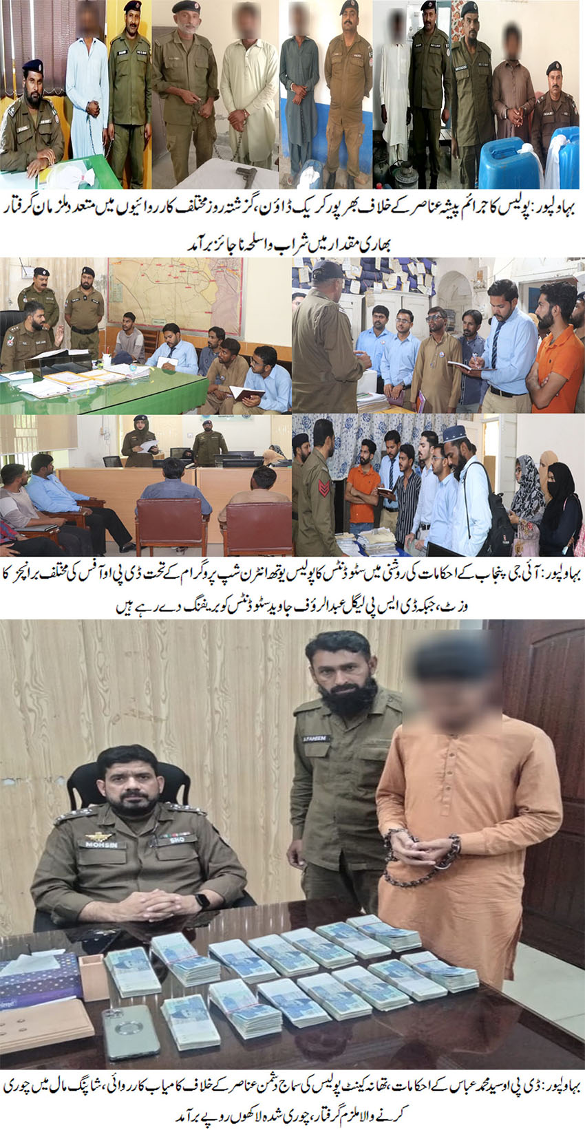 بہاولپور( )پولیس کا جرائم پیشہ عناصر کے خلاف بھر پور کریک ڈاون، گزشتہ روز مختلف کارروائیوں میں 15 ملزمان گرفتار ۔گرفتار ملزمان سے بھاری مقدار میں منشیات، شراب و اسلحہ ناجائز برآمد،ملزمان پابند سلاسل۔ جرائم پیشہ افراد کا تعاقب جاری رکھا جائیگا، ڈی پی او سید محمد عباس